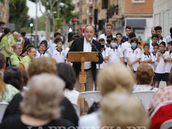 Albacete, 2 de junio de 2022. El alcalde, Emilio Sáez, ha destacado esta tarde la “plena dedicación” de Francisco Hurtado al movimiento vecinal y a la defensa de los intereses de los ciudadanos de Albacete, declaraciones que ha realizado durante el acto de colocación de una placa con el As de Hoy, el polideportivo de el Colegio de Educación Primaria y Primaria Diego Velázquez (CEIP), lleva el nombre de este líder barrial, fallecido el año pasado.